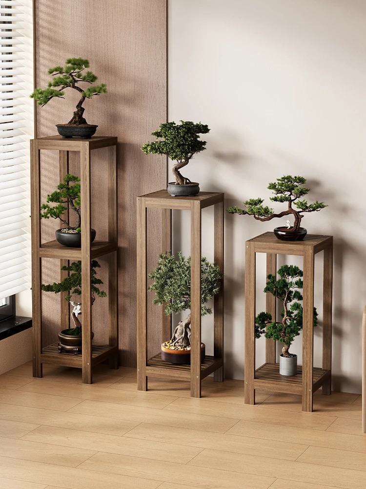 三夢の無垢材フラワースタンド - リビングルームやバルコニーに最適な床置きタイプの収納ラック!おしゃれな植物ディスプレイで、インテリアを一層引き立てます。