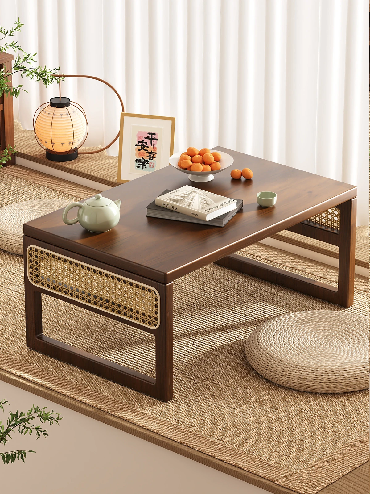 Stylish Rattan Coffee Table for Bay Windows - Minimalist Tatami Desk for Bedroom, Perfect for Study or Work, Ideal as a Low Computer Table or Cozy Side Table.