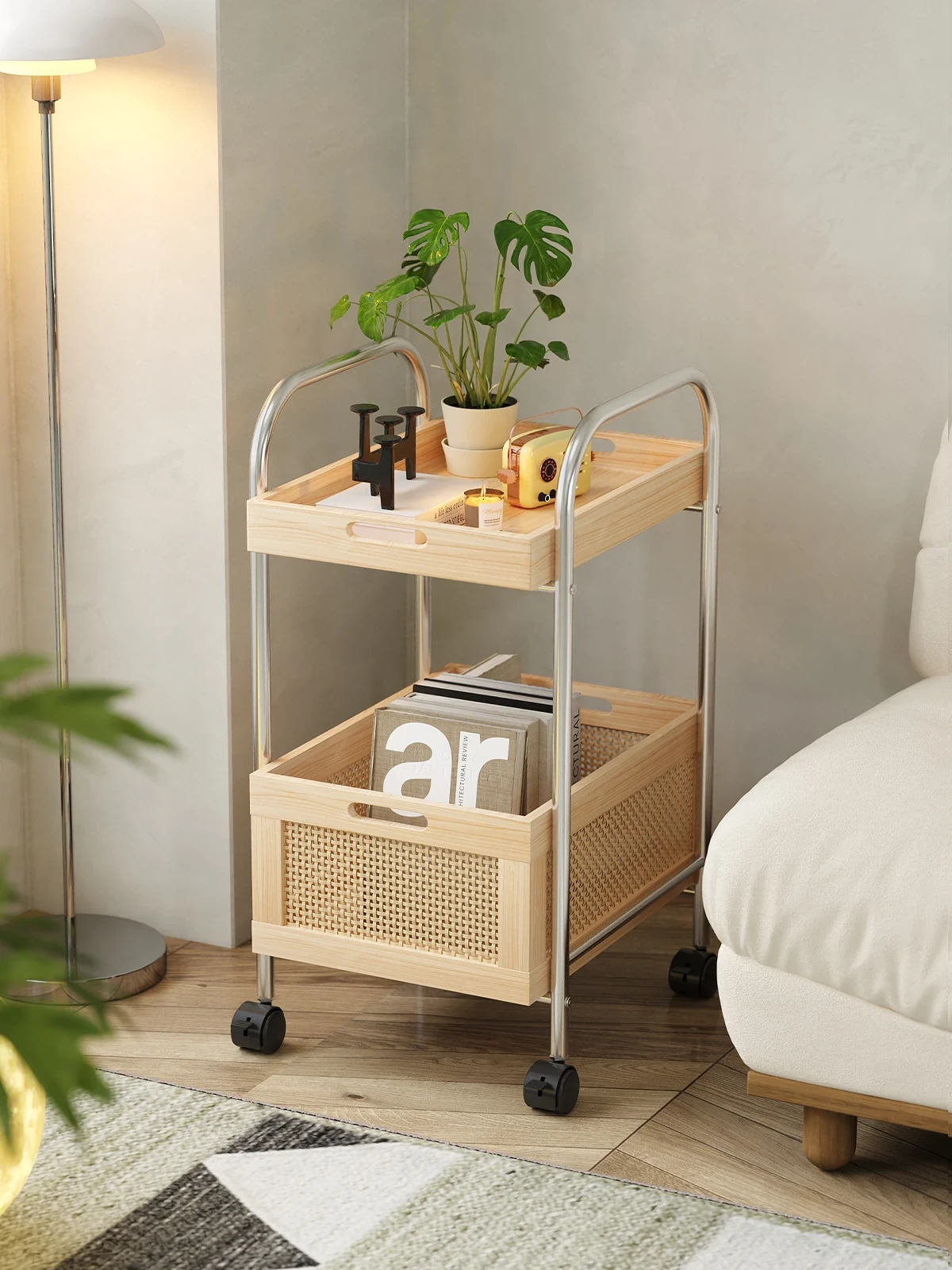 Dreamy Mobile Cream Wind Sofa Side Table with Iron Cart - Minimalist Living Room Nightstand & Storage Rack for Bedroom